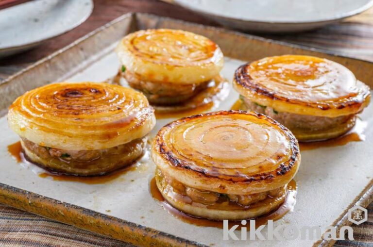 - 玉ねぎの片面に片栗粉をまぶし、(2)を、玉ねぎの片栗粉がついた面を内側にして2枚ではさむ。